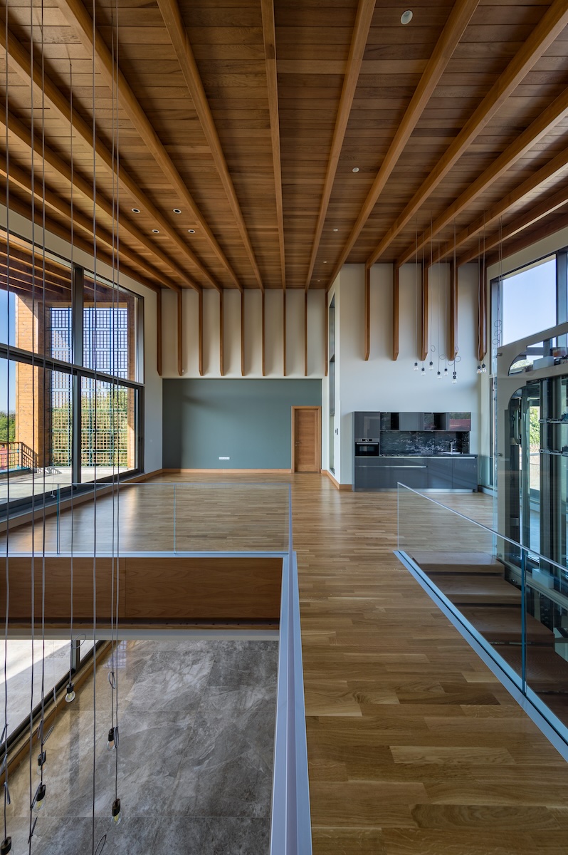 The main materials used in the volume are wood and stone. The area of site is 1670 sq. m. which was designed with an area of 618 sq. m. (400 sq. m. residential space) in two floors. The ground floor with an area of 200 sq. m. includes common spaces of living room, dining room, the main kitchen, guest room and tea room (a space for sitting and talking) and the 2nd floor measuring 200 sq. m. includes 4 bed rooms (one for parents and 3 for children), living space, kitchen, laundry and bathroom. The yard in this project has been designed as green levels along the porch and semi-open spaces considering the slope of the land.