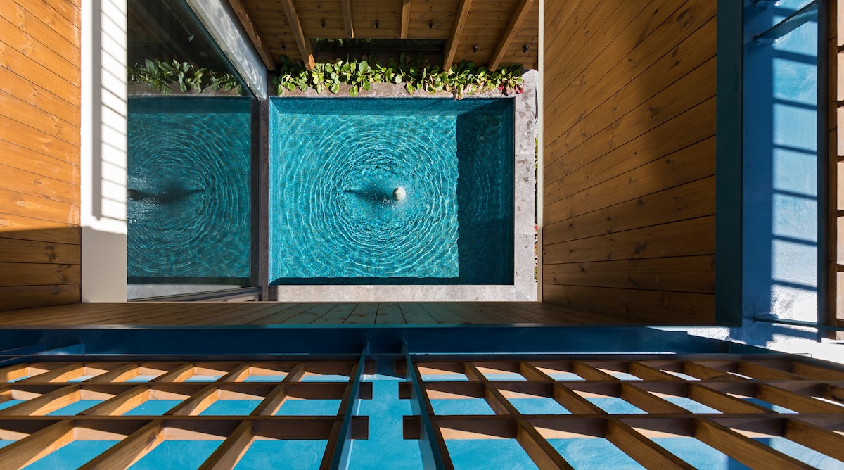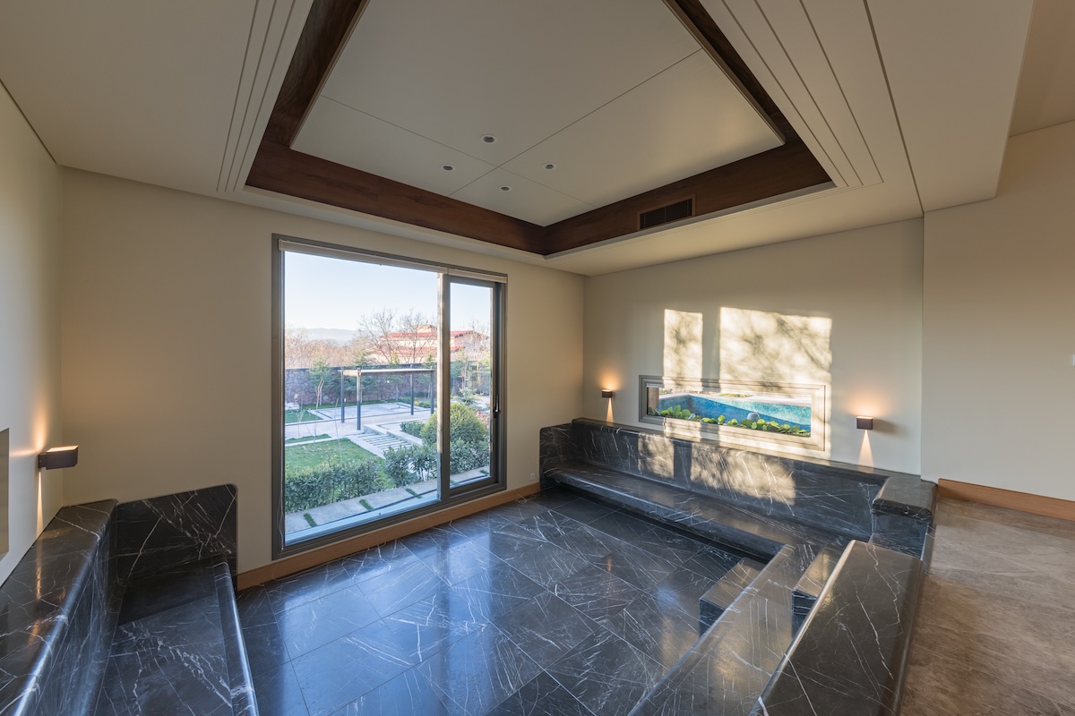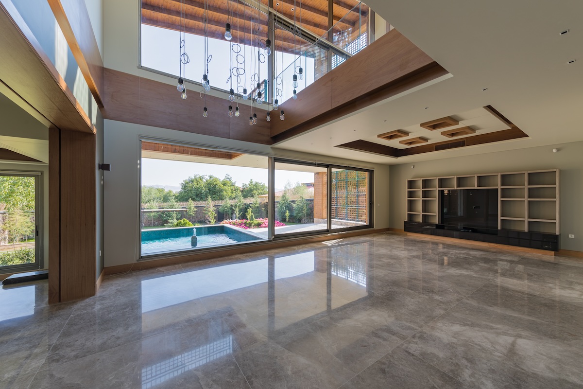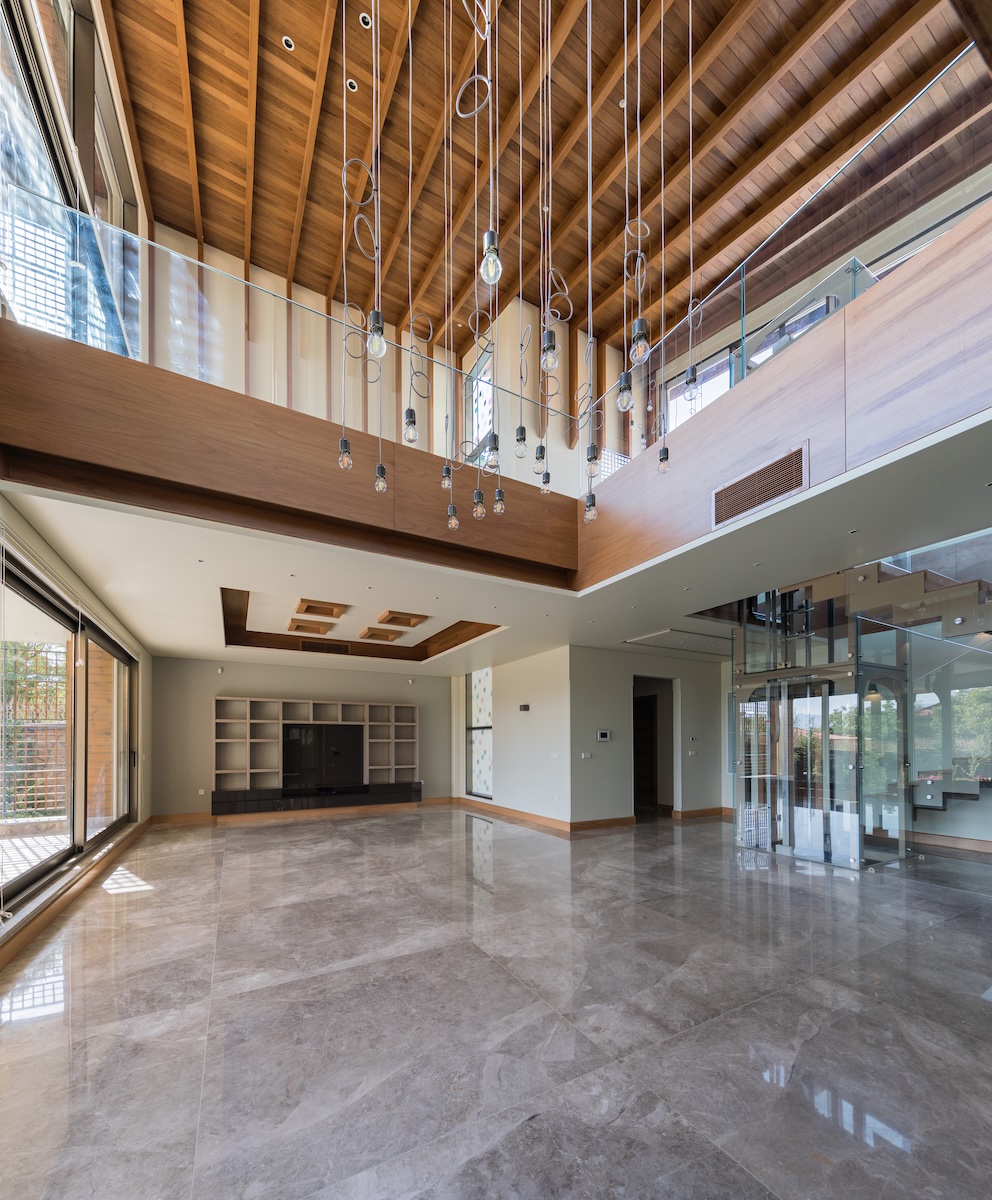 There is a mesh wall, combination of metal (structure) and wood (filling material), on west side of the porch to serve as a semi-open cover for prevention of west side sunlight while emphasizing the porch volume and creating a sense of lightness. The tea room space (the space for sitting and talking) is one of the outstanding features of this villa. This space is located in the space adjacent to the yard, with fountain under the void and dining room and sitting room, considering the lifestyle of this family who respect the family solidarity and conversation between the family members and gathering together as one of the pillars of the life. Mirror works and view to water have been used in this space for emphasis on its idea. In other words, to create a feeling replete with gentle flow of life, water and mirror have been combined with each other.